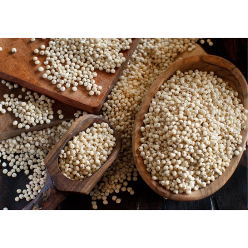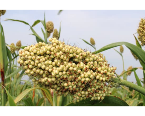 The sorghum grain is small and rounded, varying in colour from off-white to varying shades of red, yellow or brown.