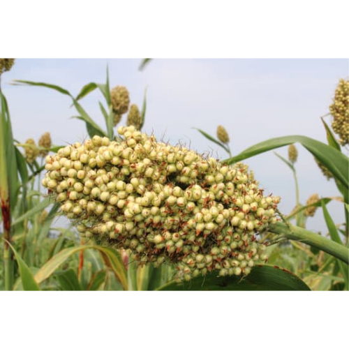 The sorghum grain is small and rounded, varying in colour from off-white to varying shades of red, yellow or brown.